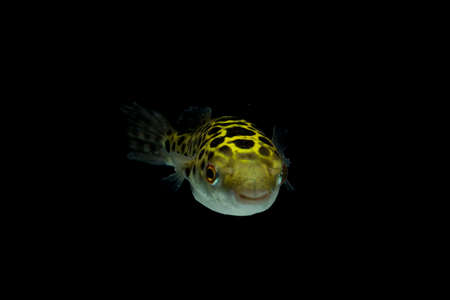 Spotted green pufferfish, tetraodon or Dichotomyctere nigroviridis on black background