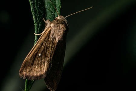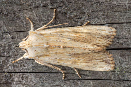 Closeup on the lightbrown obscure wainscot owlet moth, Leucania obsoleta , sitting on a piece of wood in the garden