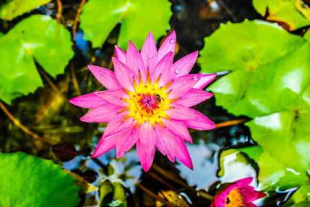Beautiful Thai Lotus that have been appreciated with dark blue water surface, abstract nature background.