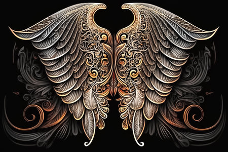 Angel wings on black background, abstract ornate isolated illustration, generative AI.