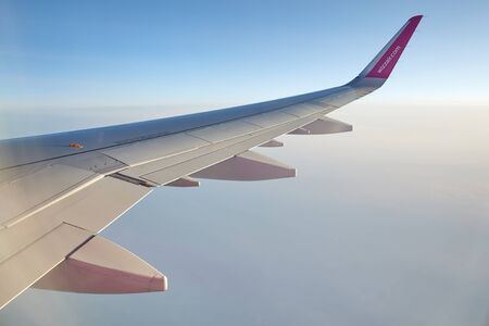 BARCELONA, SPAIN - AUGUST 20, 2016: Wing of a passenger plane, blue sky and clouds. Copy space. Space for text