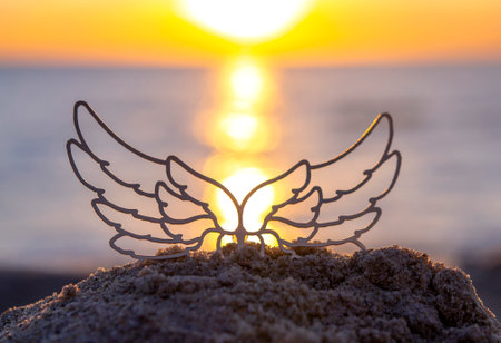Black silhouette stick with transparent wings in sand on sandy beach of sea shore against sea background, sea waves and sun path during sunrise or sunset with rising or setting sun close up. Concept