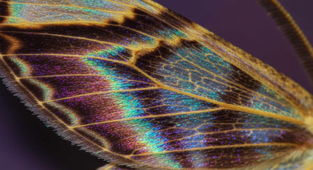Detailed close-up of a butterfly wing showcasing vibrant colors and intricate patterns in natural light