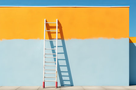 ladder on bright colored wall, in the style of yellow and black minimalism, by ai generative