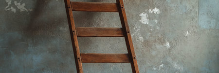 A wooden ladder stands against a textured gray wall, symbolizing progress and potential. This image is perfect for construction, renovation, or creative project concepts.