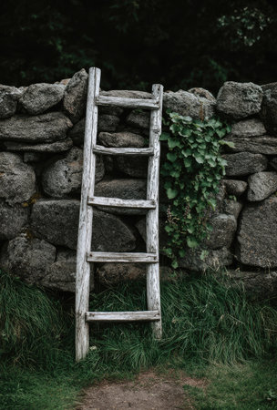A weathered wooden ladder leans against a rough stone wall, set against a backdrop of foliage. The image showcases natural textures and muted tones, suggesting an outdoor environment. This composition could be used for various purposes including editorial and commercial design projects.