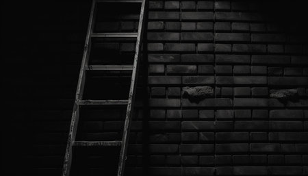 Wooden ladder stands against textured, dark wall, illuminated by soft light, creating dramatic and moody atmosphere. This evokes sense of ascent and possibility