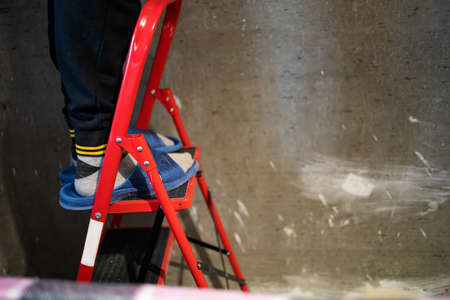 Close-Up Of Legs On Steel Ladder When Do Repair In Apartment. Renovating In Old House