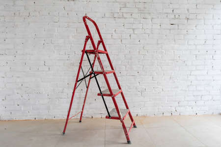 Aluminum ladder at the construction site against the background of a red brick wall. Work at height. Safety engineering