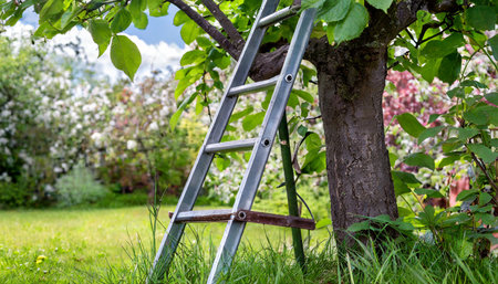 Old wooden ladder leaning against plum tree in orchard during harvest season, ready for picking ripe plums