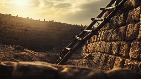 A ladder leaning against a rusted wall. Generative AI image.