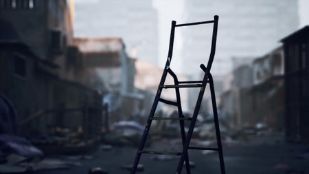 An abandoned ladder is positioned in the center of a rundown city, surrounded by debris and signs of neglect, as the light fades at dusk, creating an eerie yet intriguing atmosphere.