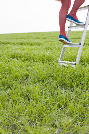 Woman climbing a ladder in a field