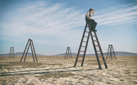 Businessman climbed on top of the stairs looking up to horizon surrounded by other stairs. Success business and ambitions concept. This is a 3d render illustration