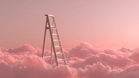 A step ladder in focus, extending upward into soft pink clouds, surrounded by a soft pastel pink sky, evoking feelings of tranquility and wonder