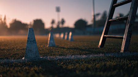 A serene morning view of a sports training field featuring cones and a ladder, capturing the essence of preparation and focus in athletic training.