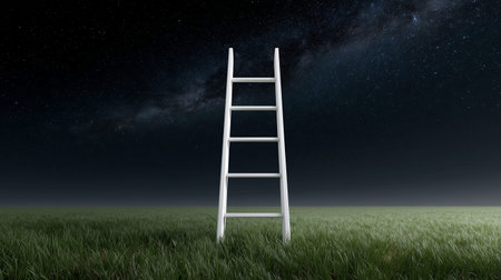 A solitary white ladder rises from lush green grass, reaching toward a brilliant starry sky. The scene captures a sense of wonder and tranquility in the nighttime landscape.