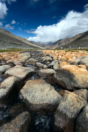 Scenic view between path on Khardung La, mountain pass in the Ladakh region of Jammu and Kashmir. The pass on the Ladakh Range lies north of Leh and is the gateway to the Shyok and Nubra valleys