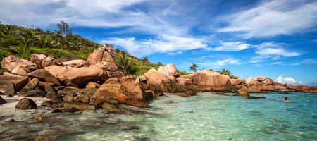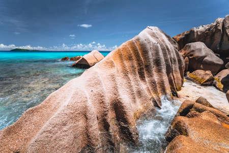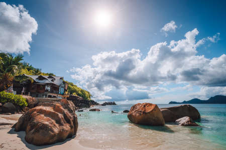 Anse Marron beach with big granite stones in La Digue Island, Seychelles. Tropical landscape with sunny sky.
