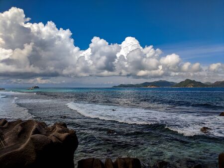 Grand Anse beach, Seychelles, La Digue, tropical sandy beach, blue ocean and rainy clouds