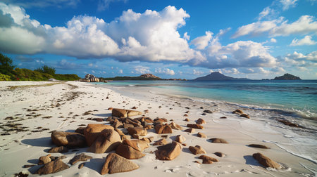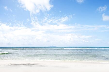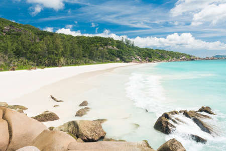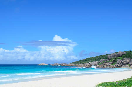 Grand Anse exotic pristine beach at La Digue island in Seychelles. White sandy beach with blue ocean lagoon, rolling waves, white clouds, granite rocks in background.
