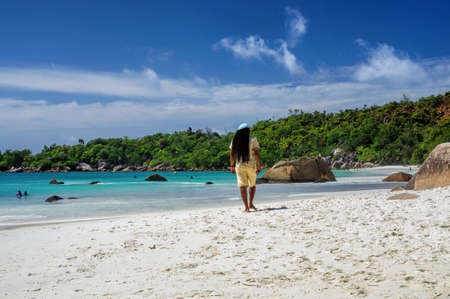 SEYCHELLES, PRASLIN - AUGUST 03: Rasta is walking along a Anse Lazio beach at Praslin island on August 03, 2015, Seychelles. Anse Lazio is considered to be the best beach on Praslin, Seychelles