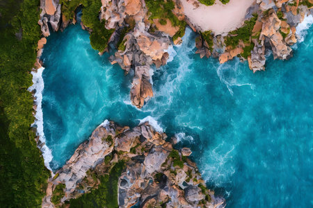 Stunning aerial shot of vibrant turquoise ocean water crashing against a rocky coastline. Lush greenery surrounds the dramatic landscape.