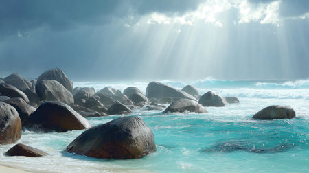 Breathtaking coastal scene featuring numerous large, smooth boulders partially submerged in vibrant, clear turquoise water. Above, dark, brooding storm clouds are contrasted by brilliant shafts of sunlight breaking through, casting ethereal rays onto the turbulent ocean surface and the wet rocks.