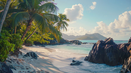 Tropical beach paradise with lush foliage