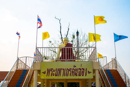 Sculpture of a monk and the multi-colored flags at the temple. Ayutthaya Thailand