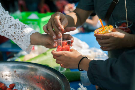 Charity food is free for people in slums : Hands of volunteers serves free food to the poor and needy in the city
