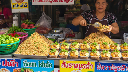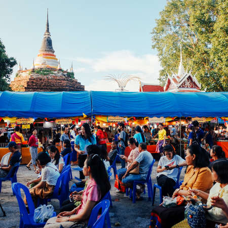 Phuket, Thailand - March 25, 2018: Local vendors are selling local fruit along the street at Lard Yai, Phuket weekend market, in Phuket old town area, Thailand