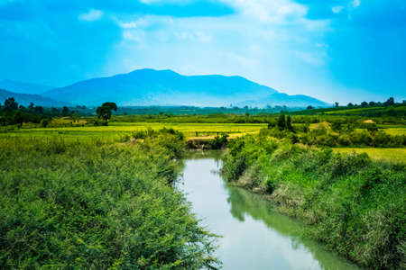 Landscape view of rice fields and river in the countryside of Thailand.