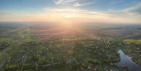 Panoramic view from the mountain to a small rural settlement among fields and forests at sunset in summer.