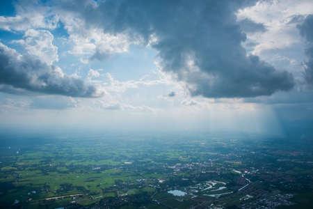 Approaching storm clouds with intersecting sunset and valley view in Beskydy mountains, Czech Republic, Europe. Aerial view to sunbeams falling on mountains and valleys.