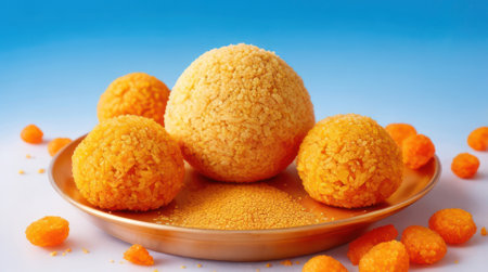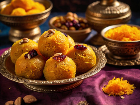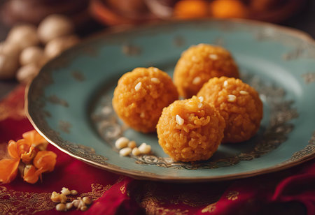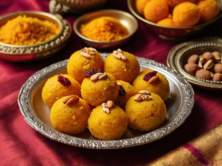 Plate of Motichoor laddoos with vibrant colors and rich textures, highlighting their traditional preparation and festive appeal.