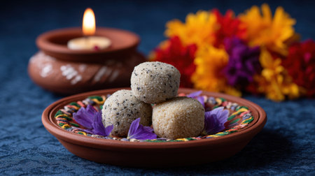 Delightful Indian sweets presented on a traditional clay plate, surrounded by vibrant flowers and a glowing diya candle, perfect for festive celebrations.