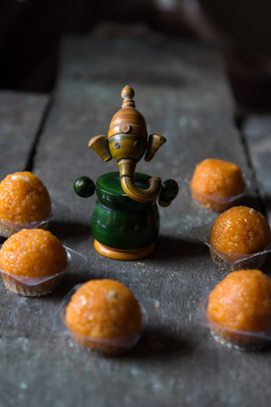 Hindu God Ganesha idol on a wooden background with traditional sweets. Close up, selective focus.