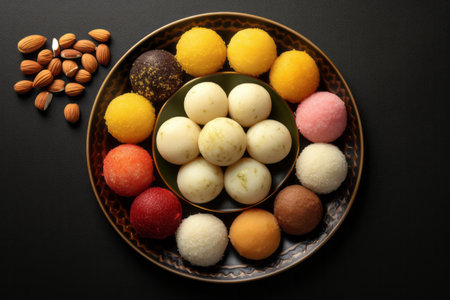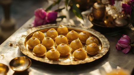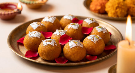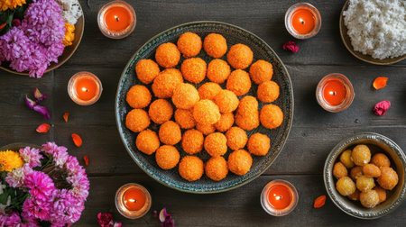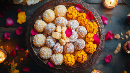 A beautiful arrangement of traditional sweets on a decorative plate, surrounded by flower petals and candles, creating a vibrant atmosphere for festive celebrations and joyful moments