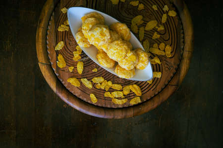 A close-up view of golden snack balls made with crispy rice and spices, showcasing a vibrant texture and inviting appearance on a wooden surface.