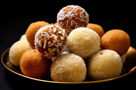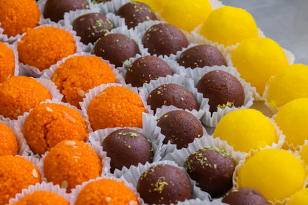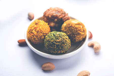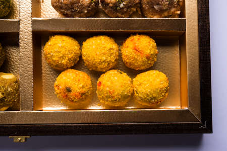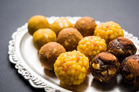 Stock photo of variety of sweet laddu or laddoo or ladu, a sweet dumpling made up of bundi, dry fruits or rava, selective focus