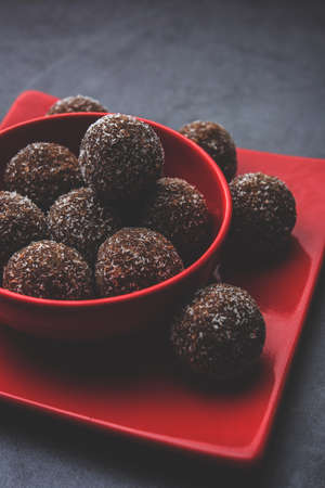 sweets from dried fruits with nuts and sesame seeds Tasty energy balls with dried fruits and nuts in coconut chips on a white plate