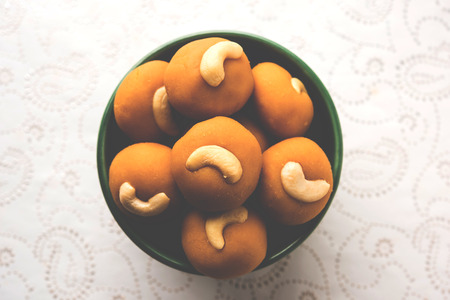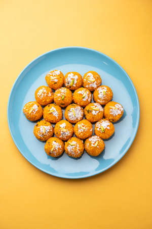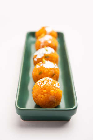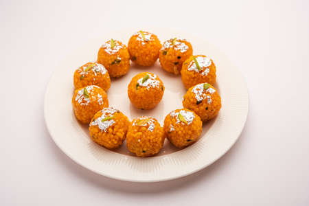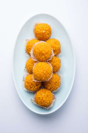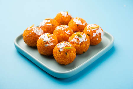 indian sweets bundi laddu or motichur laddu or motichoor laddu, selective focus