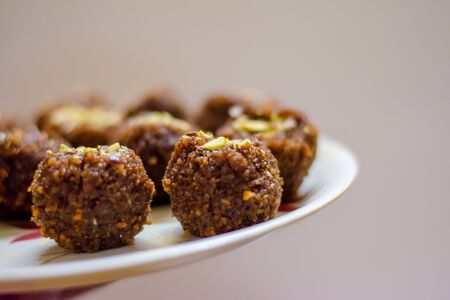 Fresh Homemade ladoo or laddu, made by bread crumbs with pistachio on it, with selective focus