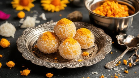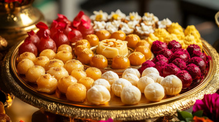 Decorative Indian sweets on a shiny plate surrounded by colorful flowers and spices, showcasing a rich culinary tradition and cultural celebration. Perfect for festive occasions.