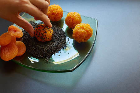 Raw vegan healthy dessert. process of cooking Energy balls from dried apricots. Black sesame for crumbling. Gray background with copy space