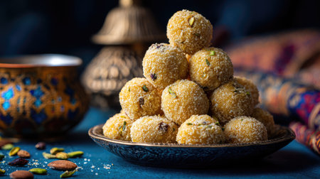 This image showcases delightful Indian sweet balls, adorned with colorful nuts and edible flowers, elegantly presented on a gold-plated plate, perfect for celebration.
