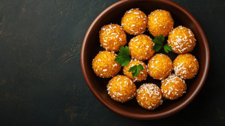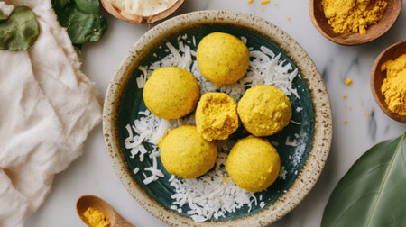 An enticing display of round yellow sweets on a bed of coconut rice, highlighting vibrant colors and textures. Perfect for culinary inspiration and festive occasions.