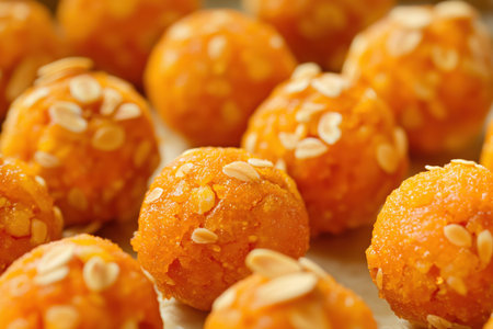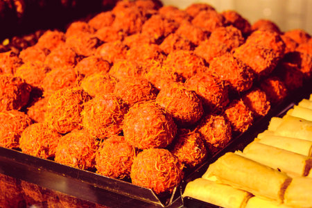 Traditional Indian dish: motichoor laddoo or bundi laddoo - ball shaped sweets with sugar, nuts, ghee on counter at summer food market: close up. Vegetarian, oriental, dessert, sweet food concept