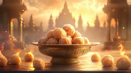 A beautifully arranged plate of golden sweets surrounded by glowing flames, set against a breathtaking sunset backdrop, perfect for festive celebrations.